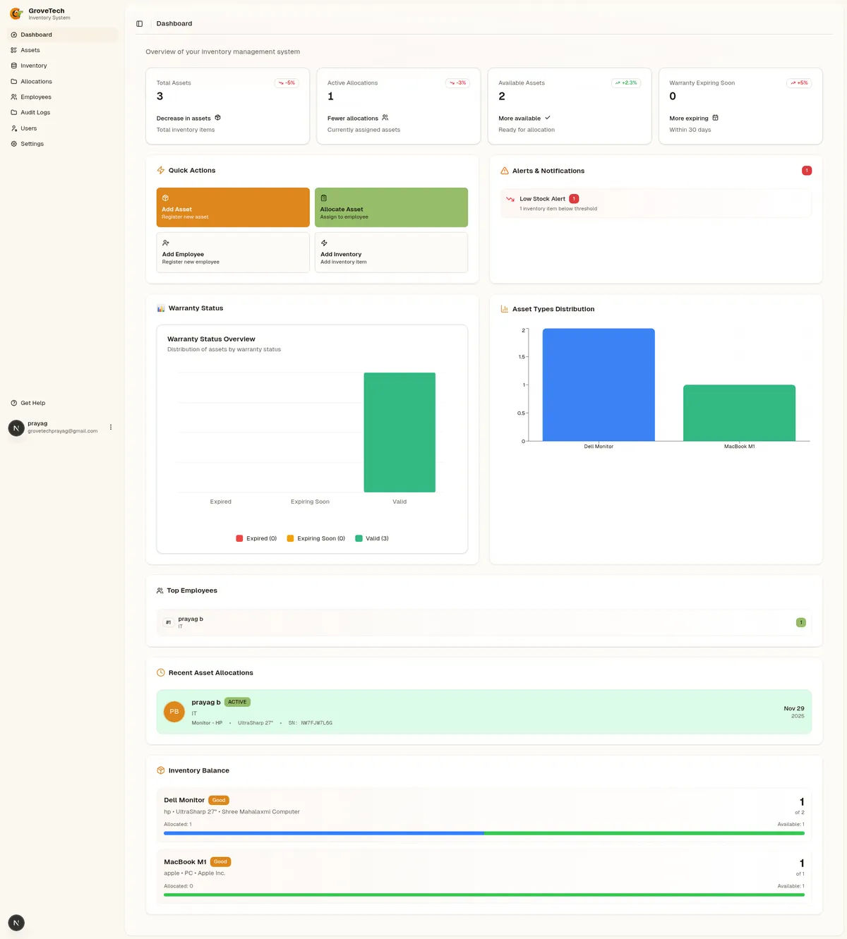 Internal asset tracking system for IT equipment—laptops, monitors, peripherals. Assign devices to employees, track who has what, and keep a full audit trail. Automated alerts fire when stock runs low or warranties are about to expire. Clean admin dashboard for reporting.